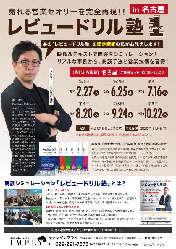 売れる営業セオリーを完全再現!! 映像&テキストで商談をシュミレーションしながら、営業手法と営業技術が 習得できる「レビュードリル塾」。第1期から第4期まで開催した『レビュードリル塾 season1』を認定講師がお教えします。 2020年2月から名古屋で開講!受講生募集開始しました。 詳細・お申込みはこちらから