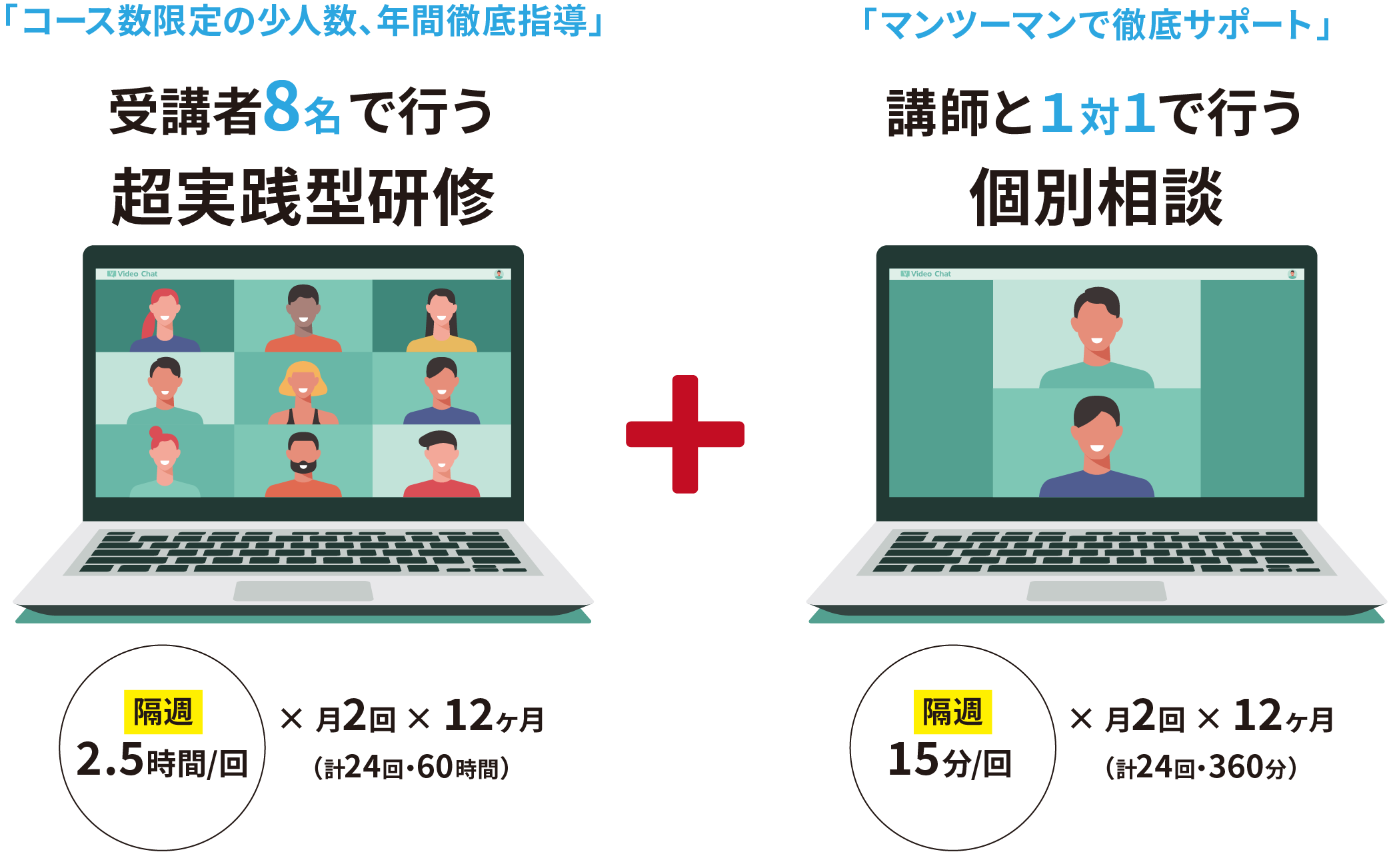 レビュー道場は、1年間「集合研修」と「個別相談」を隔週交互に月2回ずつ行います。